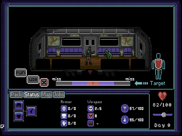 Dustbowl is at its core, a survival game. Scavenging nearby areas will be your main priority, so looting everything is crucial! By collecting as many useful items as you can, you stand a much better chance of surviving Dustbowl’s wasteland mutants. You will gain new tasks along the way, many of which will yield new and unique items to help you stay alive. The demo also features a day and night system. When night falls, a “tired” icon will appear on screen indicating that you should rest. I found that resting was essential and will give you a good portion of your health back. I would recommend doing this as often as you can to cut down on supply usage. The combat in Dustbowl is one of the coolest features the game has to offer (and you will know once the music kicks in). It uses a turn based, “timed attack” battle system where you have to time your clicks just right to achieve critical hits. It is extremely important to try and master the timed click. Enemies are randomly generated and you have limited ammunition. Some enemies can be pretty powerful and are capable of doing A LOT of damage. A missed shot could be your last if you aren’t healed properly before battle. I particularly enjoyed the text animation that appears when it is your turn to attack. The text has a horror movie / comic style that is unique and adds to the style of the game.