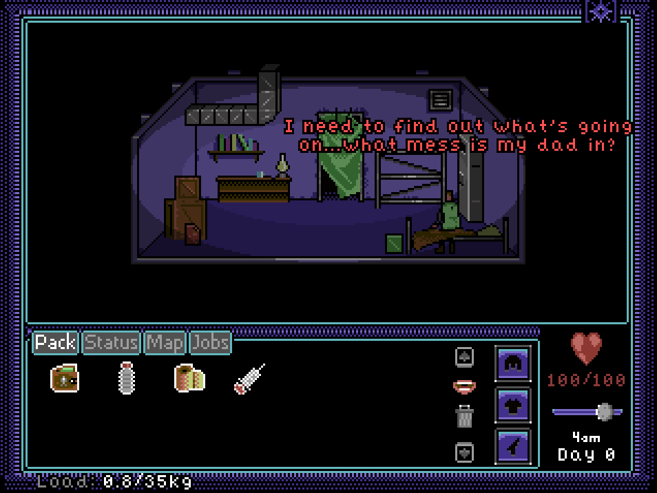 With environments that are nostalgic, designed well, and are pleasing to the eye, you are always looking forward to the next area you find. Like most pixel art games, I am a big fan of the less is more design approach. It lets the player use their imagination and fill in the blanks of the world the developer has created. Exploration plays a big role in Dustbowl and features a few Easter eggs, which I found to be a pleasant reward for exploring distant destinations. As you move about the world you will encounter other survivors, all of which have some really interesting things to say. The writing is definitely one of the games strong points, as character development is a hallmark of the genre. Another interesting aspect is the minimal use of music during exploration. It’s creepy and adds to the overall aesthetic of the world while emphasizing feelings of solitude and isolation.